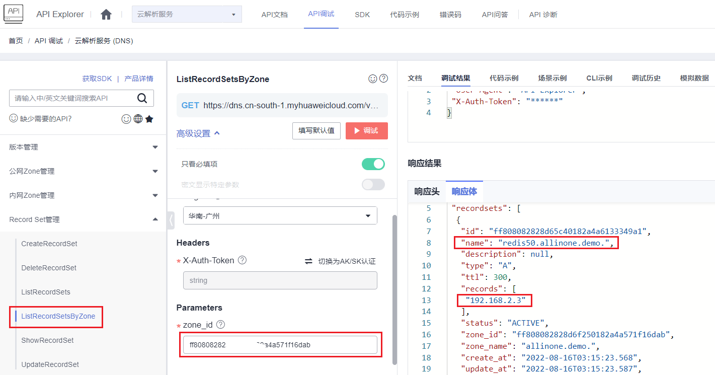 - 参数zone_id即上述步骤中获取的“域名id”,单击“调试”,响应体中即可获取内网域名对应的ip。