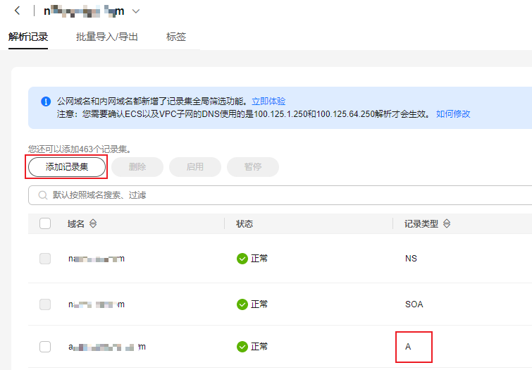 单击域名进入记录集列表,选择指定记录集。