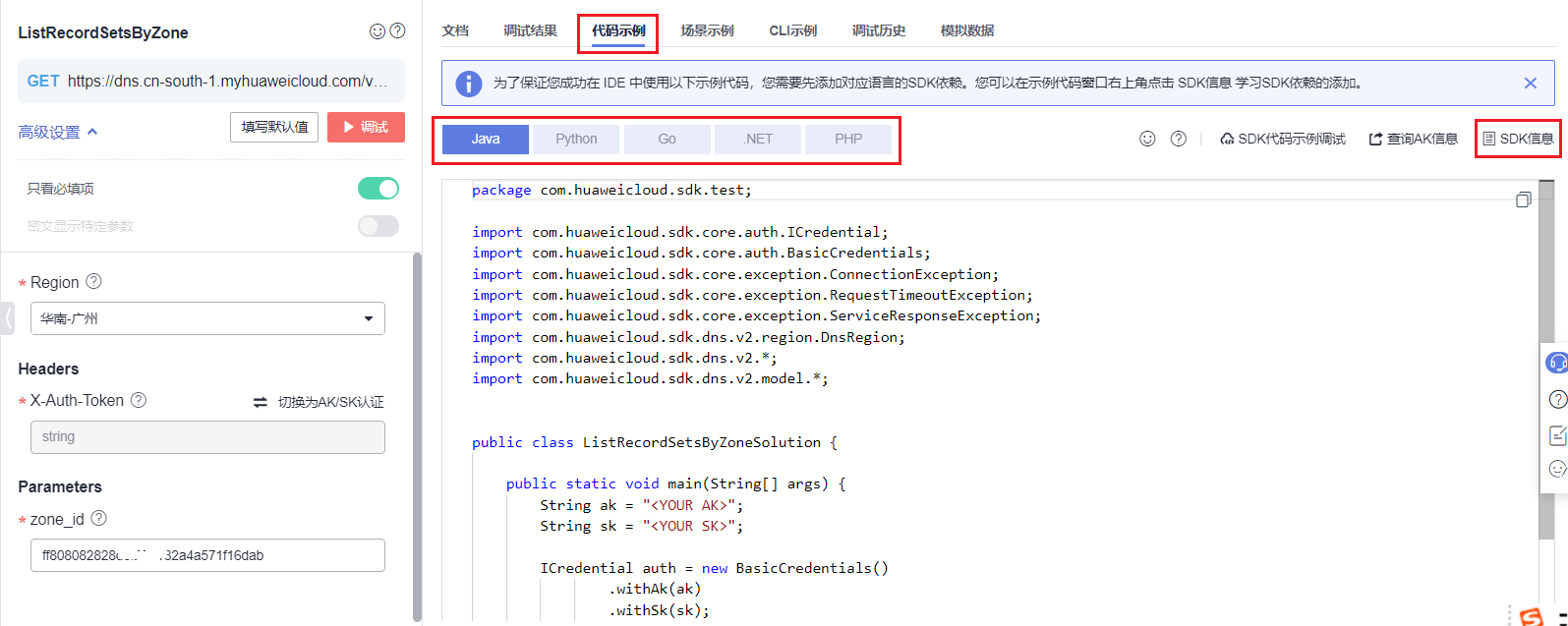- 切换到代码示例可以获取完整的代码,如需查看相关依赖请参见sdk信息。