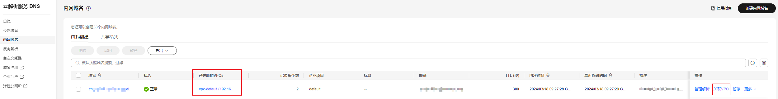登录云解析服务控制台,将内网域名关联vpc。图1 关联vpc
