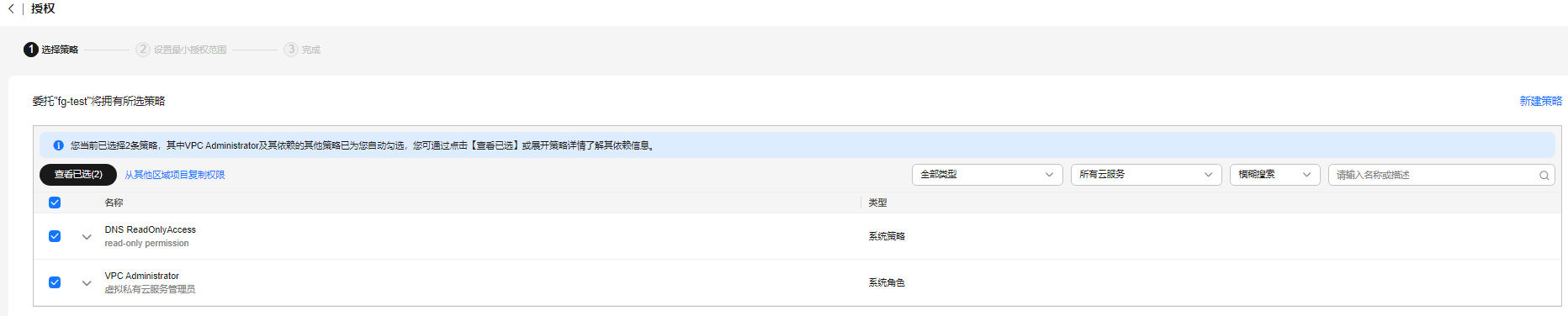 登录,为函数工作流服务配置“dns readonlyaccess”以及“vpc administrator”权限的委托。详细操作步骤可参考配置函数委托。