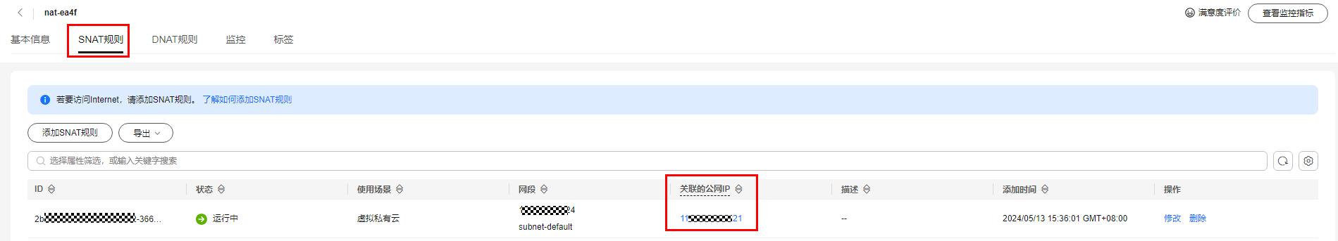 - 选择“snat规则”页签,在规则列表中即可查看公网ip地址。