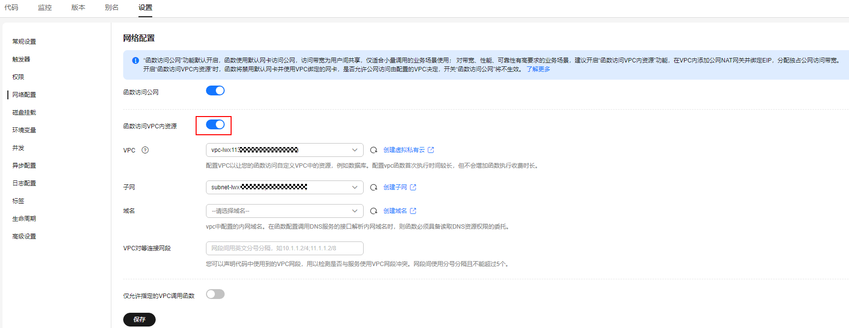 已开启“函数访问vpc内资源”功能的函数访问vpc内资源。(相关vpc配置详情请参见配置网络)