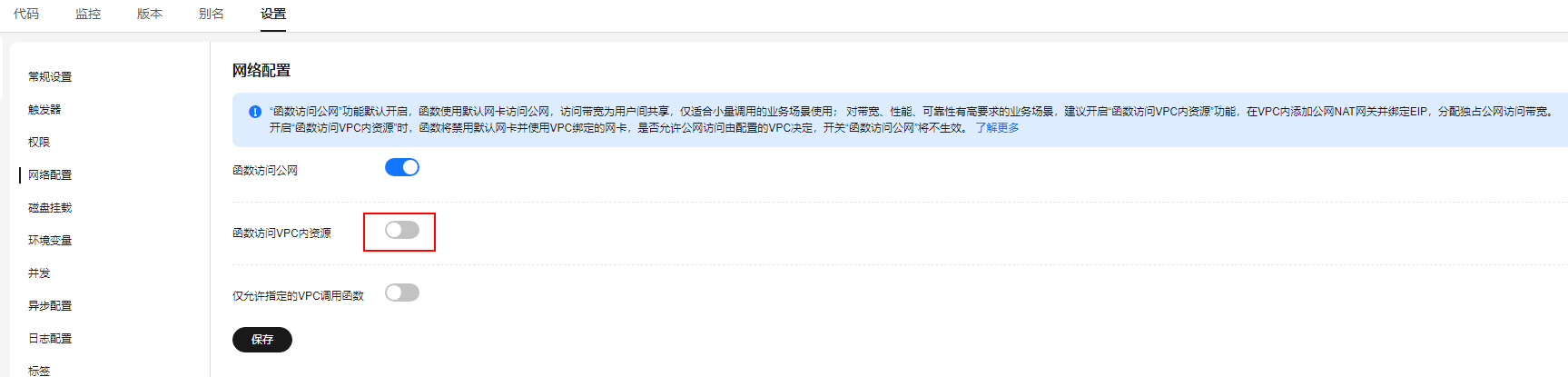 - 函数开启“函数访问vpc内资源”功能时访问公网。(相关vpc配置详情请参见配置网络)