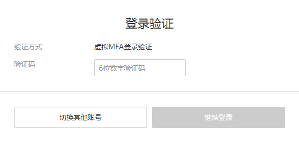 绑定虚拟mfa后,用户在进行登录操作时,需要输入mfa应用程序的动态验证码,下图以登录验证为例。