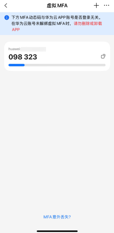此时,您需要打开智能设备上的虚拟mfa应用程序,查看并输入用户已绑定账号的验证码。以华为云app为例,选择app界面的“控制台-常用工具-mfa”,进入虚拟mfa页面获取动态码,详细如下图所示。