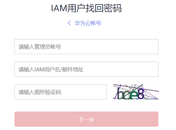 - 输入需要重置密码的iam用户的管理员账号、iam用户名/邮件地址和验证码。