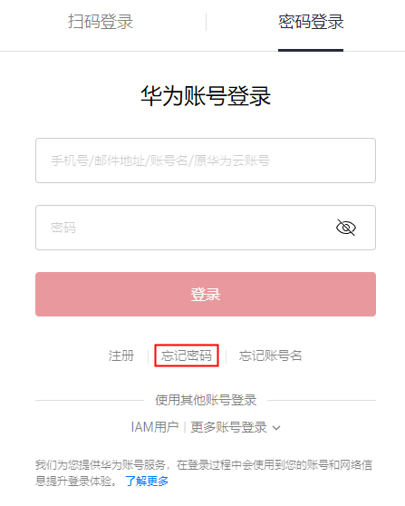- 在华为账号登录页面,单击“iam用户 > 忘记密码”。