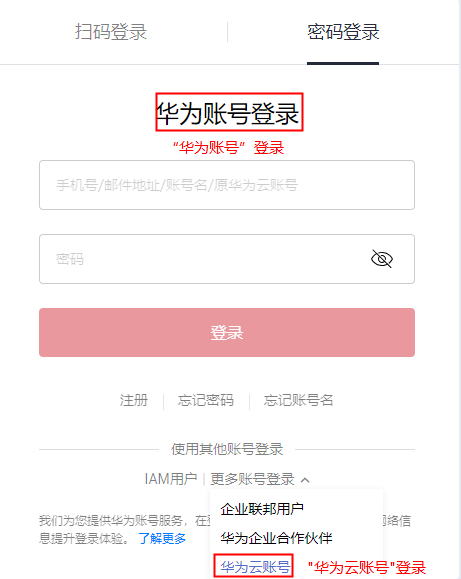 登录华为云:“华为账号”、“华为云账号”登录入口。