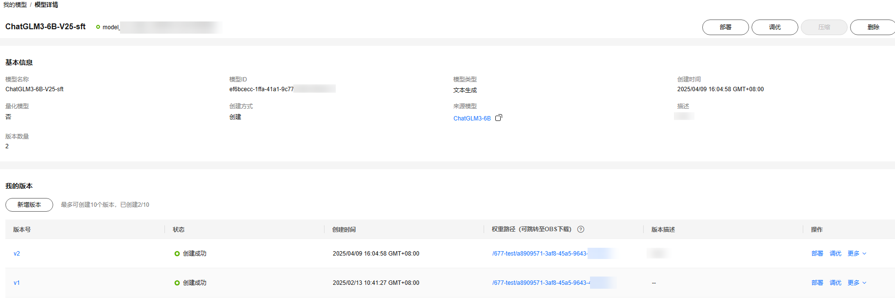 - 我的版本:可以查看已创建的模型版本,单击版本号进入“版本详情”页面,可以查看各个模型版本的详细信息和任务记录。