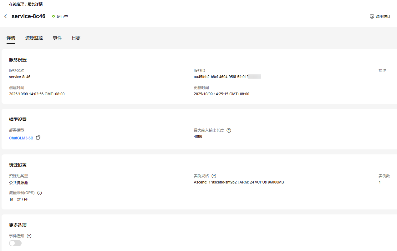 - “详情”:可以查看服务的基本信息,包括服务、模型、资源等设置信息。