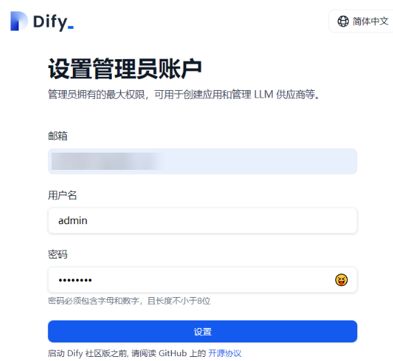 - 部署完成后,登录dify。