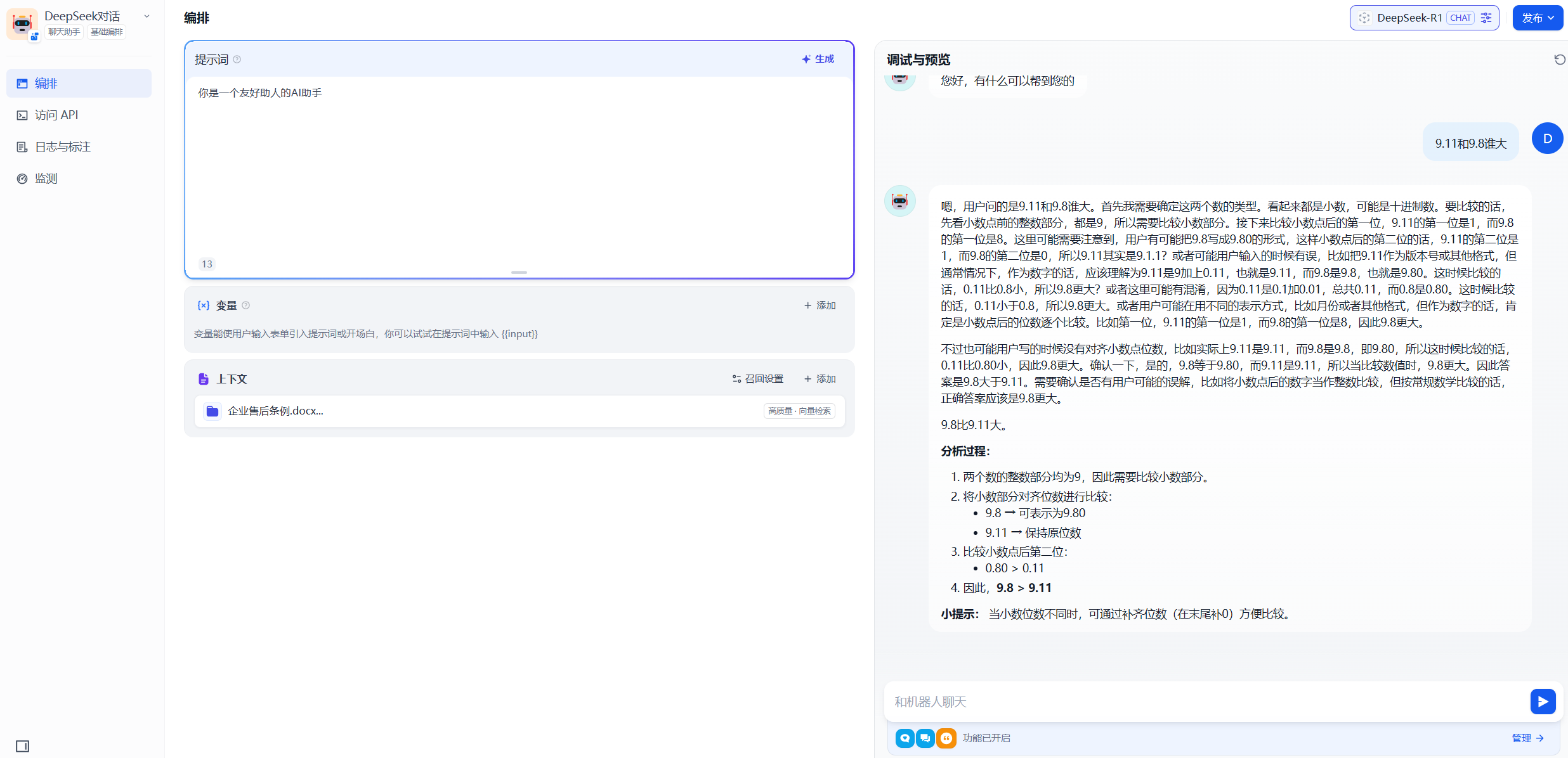 - 在“上下文”处添加上一步骤创建的知识库,让ai基于内部知识回答问题。