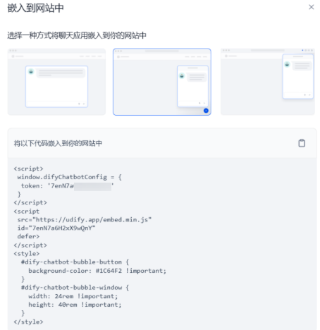 dify支持全屏界面式、悬浮窗式、浏览器插件式三种嵌入方式,请您根据需求选择合适的方式。