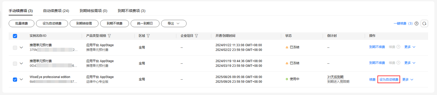 - 可对“手动续费项”、“到期转按需项”和“到期不续费项”页签的资源开通自动续费。