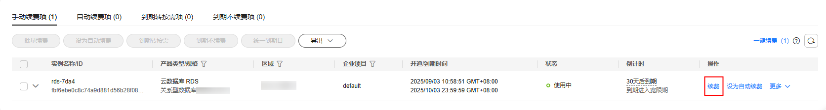 - 单个续费:在资源页面找到需要续费的资源,单击操作列的“续费”。