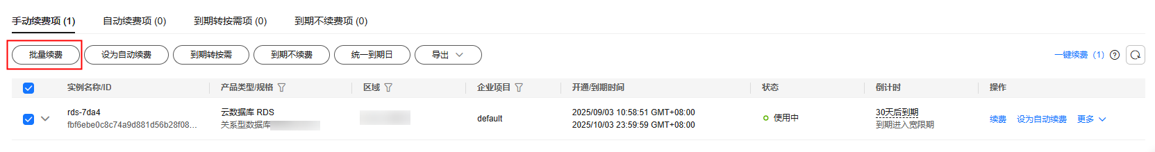 - 批量续费:在资源页面勾选需要续费的资源,单击列表左上角的“批量续费”。