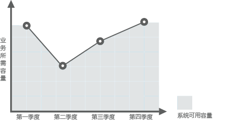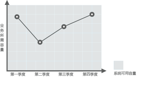 例如,运行在公有云上的基本web应用程序。此应用程序允许乘客购买火车票。在每年中期时段,人员流动性较低,此应用程序的使用率较低。每年年底和年初,人员流动性较高,因此对此应用程序的需求会显著提高。一般系统会采用添加足够多的服务器,如图1所示,或添加处理应用程序平均需求所需的容量,如图2所示,来满足业务需求。但这两种方案会造成资源浪费或无法满足高峰期的需求。当您给应用程序中添加弹性伸缩后,弹性伸缩会自动根据需求调整服务器的数量,如图3所示,为您节约成本并且满足高峰期的需求。