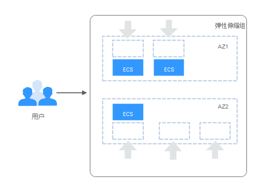 弹性伸缩尝试在为伸缩组使用的可用区之间均匀分配实例。弹性伸缩通过尝试向实例最少的可用区中移入新实例来实现此目标。