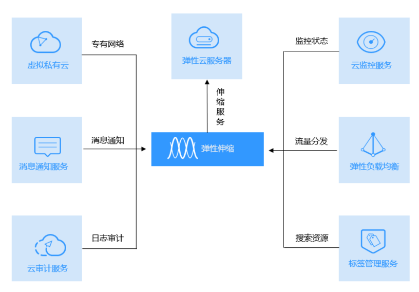 除直接使用弹性伸缩提供的对资源进行调整的功能外,若您同时购买了云服务中的其他产品,可以结合其他产品一起使用,能满足您多种场景下对云产品的需求。