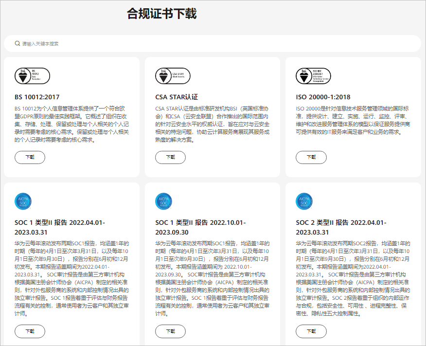 华为云服务及平台通过了多项国内外权威机构(iso/soc/pci等)的安全合规认证,用户可自行合规资质证书。