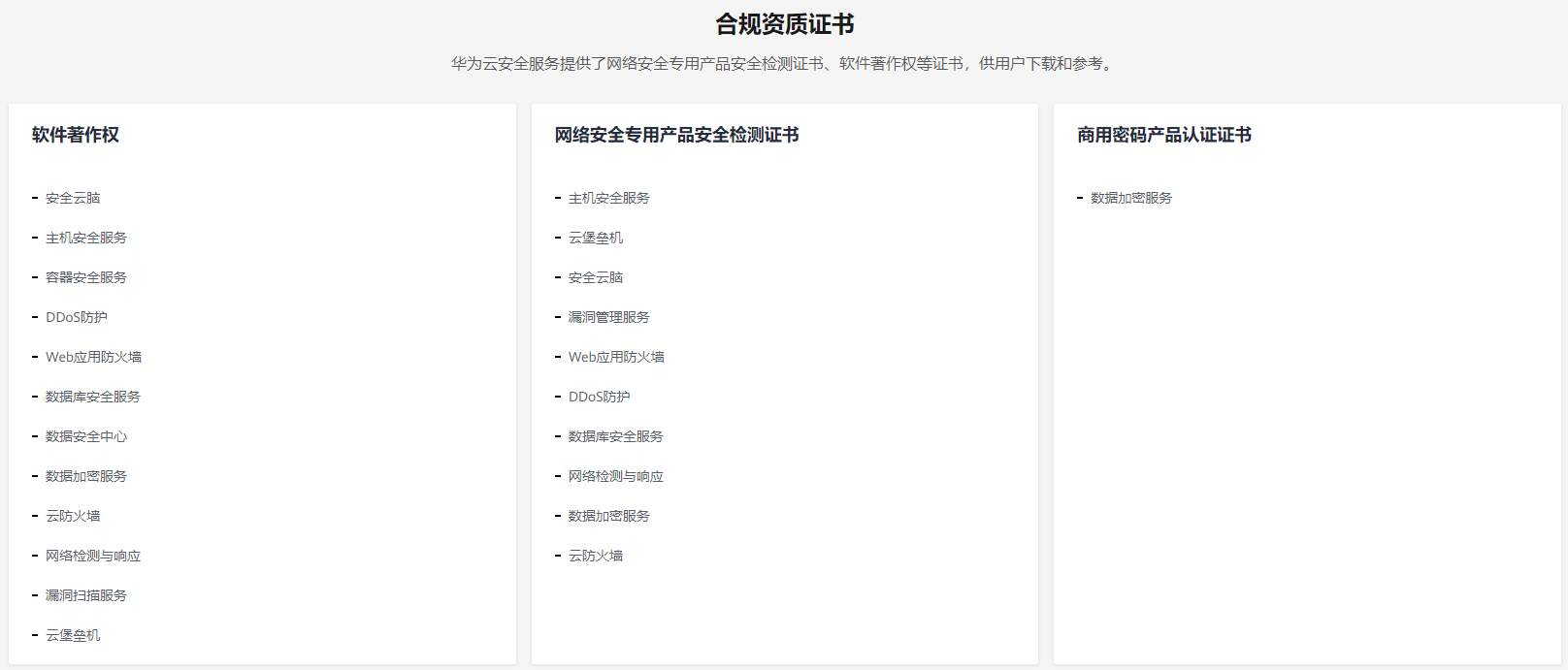 华为云安全服务提供了网络安全专用产品安全检测证书、软件著作权等证书,供用户下载和参考。具体请查看。