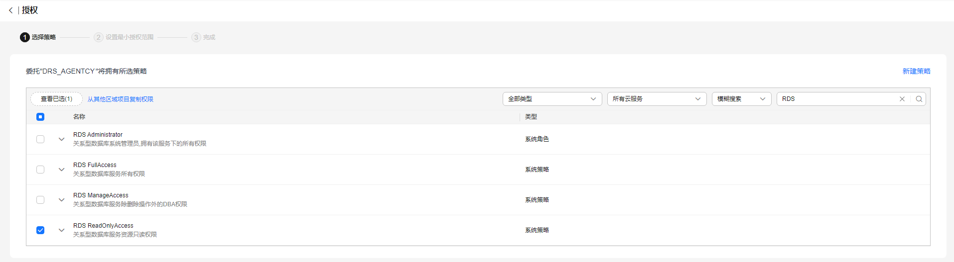 - 自建-自建任务授权策略:drs fullaccess。