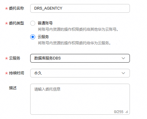 - 填写委托名称为“drs_agentcy” ,委托类型为“云服务”,选择“数据库服务dbs”;持续时间为“永久”,完成后单击“完成”。