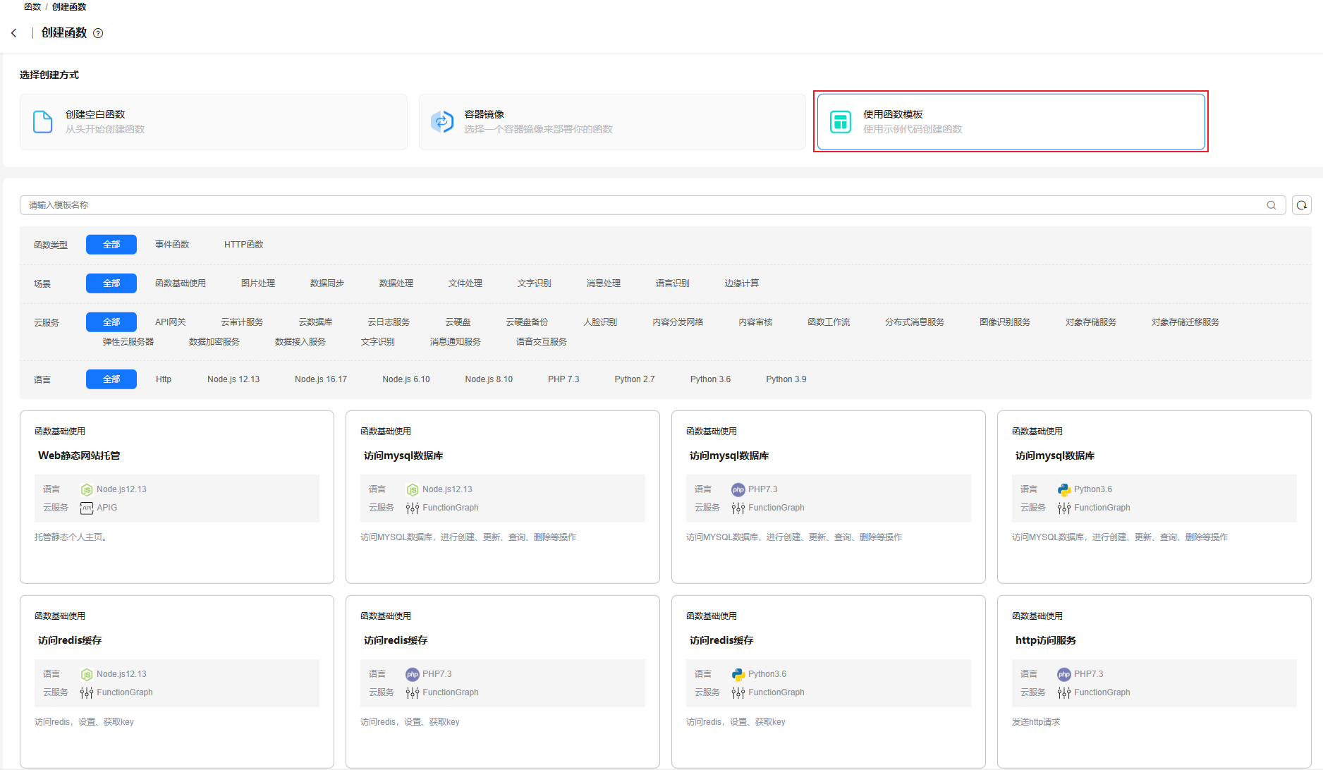 functiongraph提供多种场景的函数模板,在使用函数模板创建函数时,能够实现代码与环境变量的自动填充,快速构建函数应用。如您的需求可由函数模板满足,如图4所示,可以选择使用函数模板创建函数。