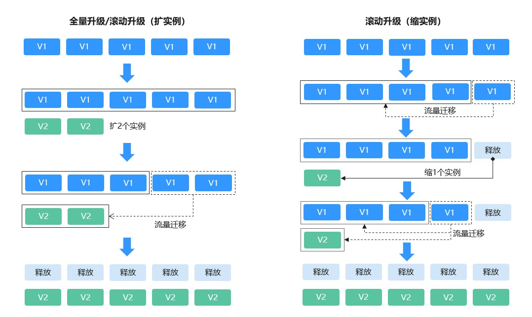通过腾出部分实例资源用于滚动升级,缩实例数越大,升级速度越快,造成业务中断可能性越大。