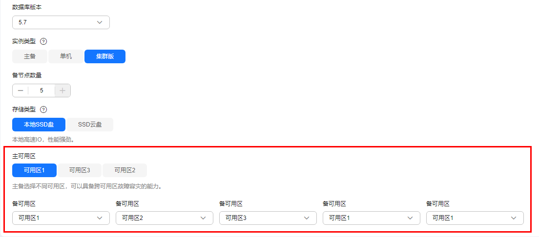 相比主备实例一主一备两个可用区容灾,rds for mysql集群版实例的每个备节点均可参与容灾切换,建议将每个节点配置在不同的可用区,实现多可用区容灾。