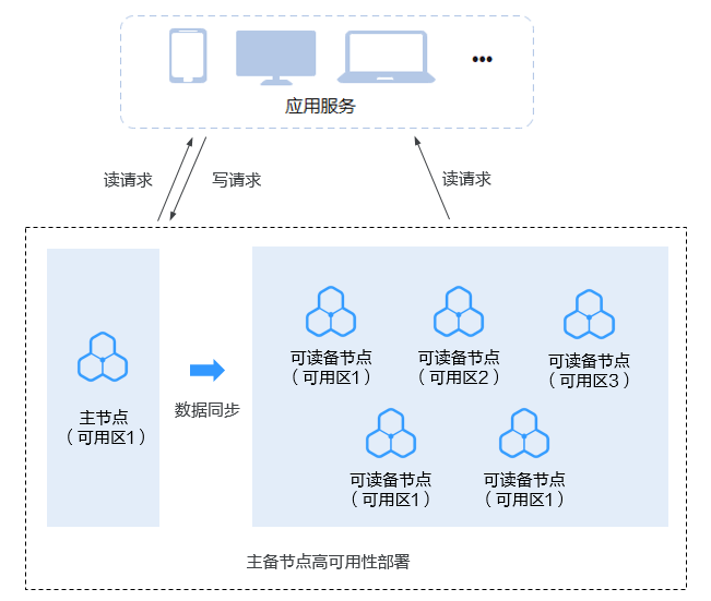 rds for mysql 5.7、8.0版本支持集群版实例类型。集群版架构为一主多备的高可用性部署,即主备节点选择不同可用区,可以具备跨可用区故障容灾的能力。所有备节点共用一个只读地址,应用程序通过该只读地址处理读请求。