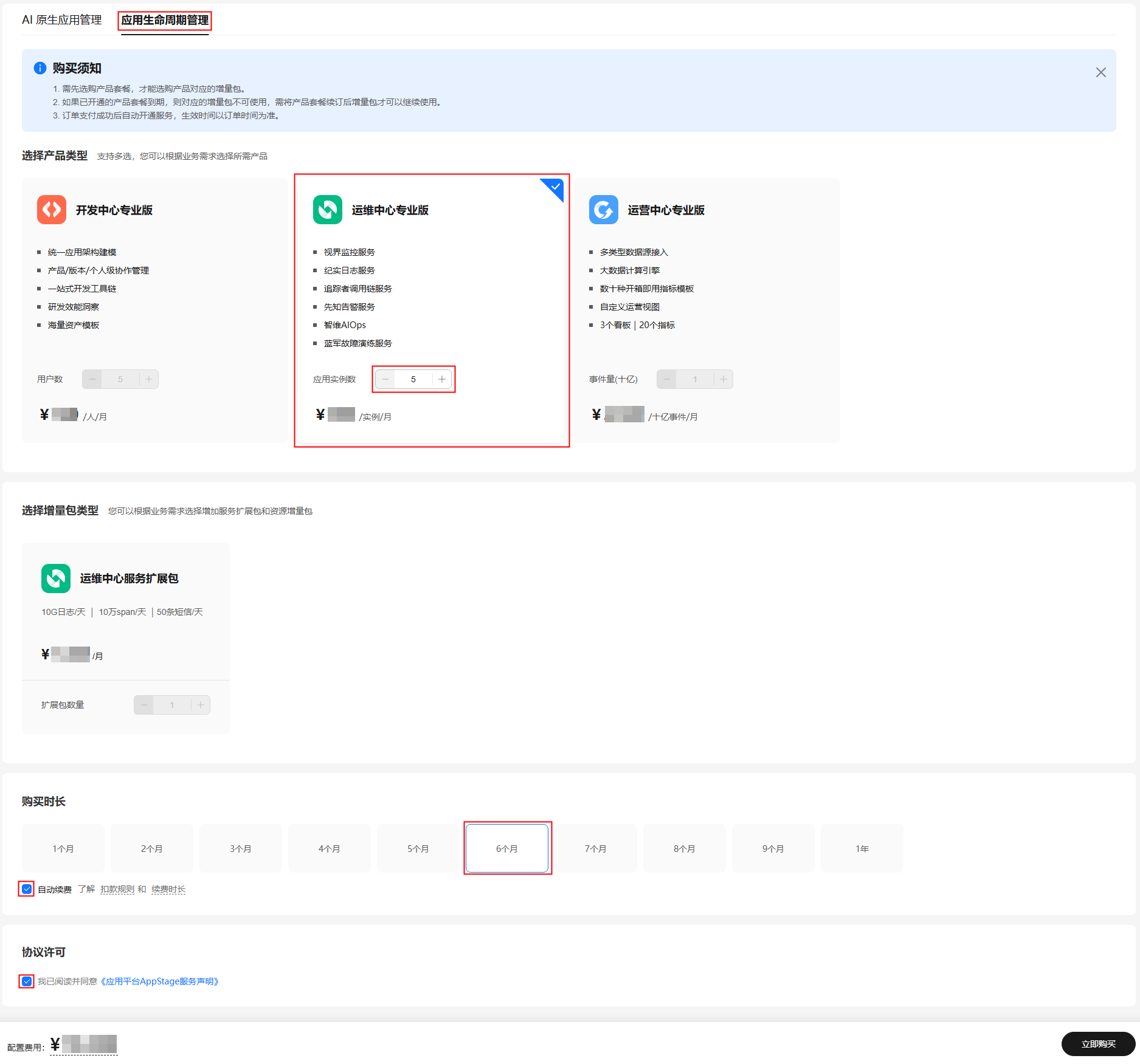 - 在“选择产品类型”区域,选择运维中心专业版并配置应用实例数为5。