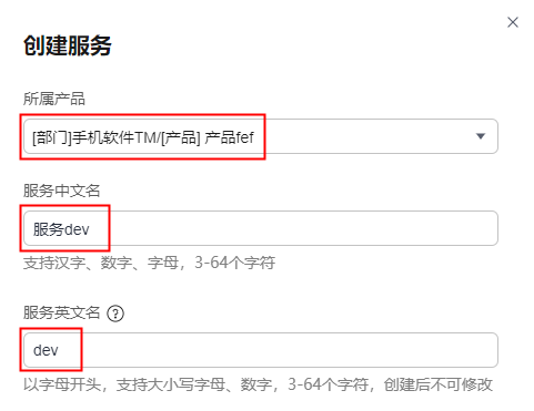 在下拉框中选择服务所属产品。创建后不可修改。