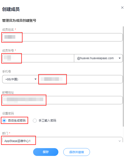 设置成员的账号密码,支持选择“自动生成密码”或“手工输入密码”。