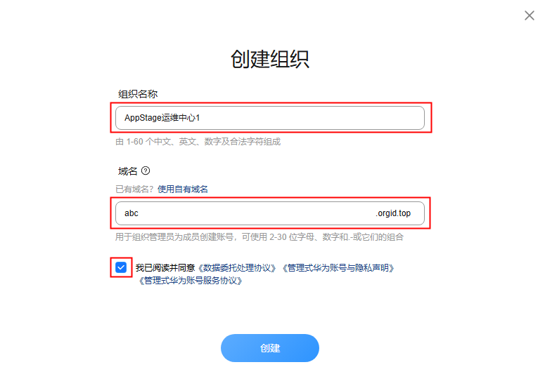 域名可以输入组织简称,使用2~30位字母、数字和.-或它们的组合,如abc,后缀名为固定的.orgid.top。
