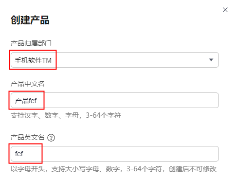 在下拉框中选择产品归属的部门。创建后不可修改。