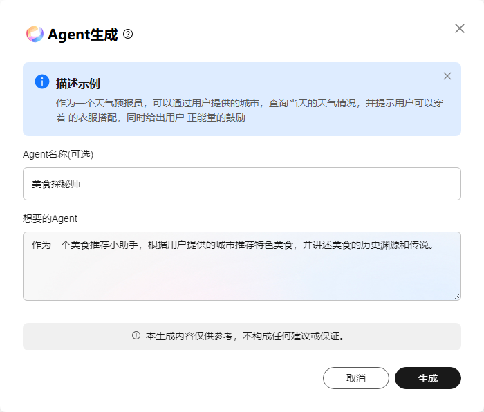 - 单击“agent生成”,在“agent生成”弹框中,输入agent名称及描述,单击“生成”。