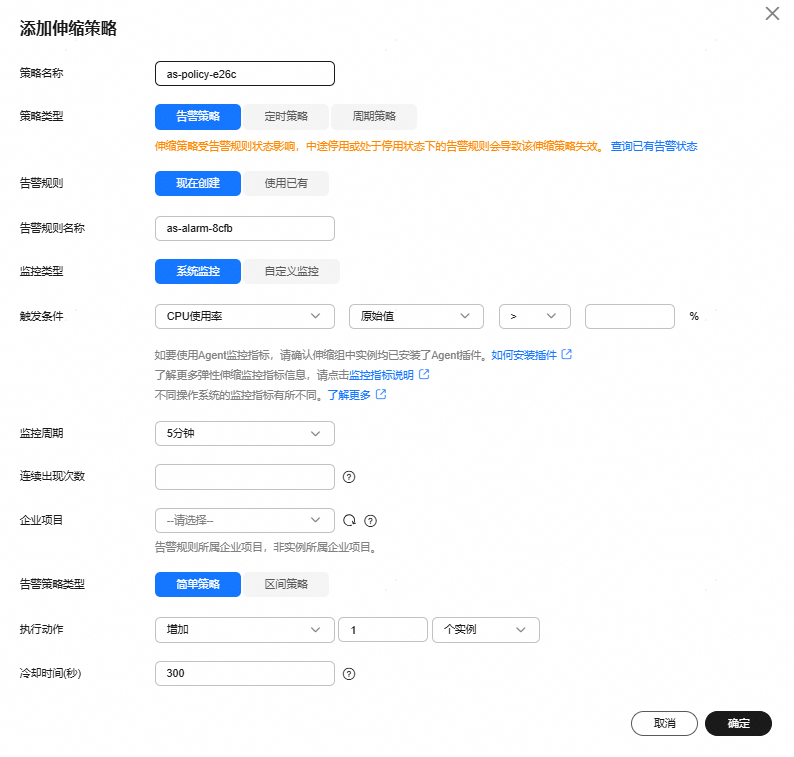 - 设置“添加伸缩策略”参数。