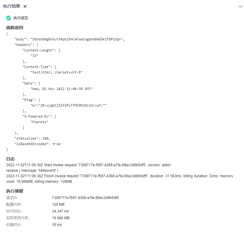 单击helloworld事件的“测试”,执行后,在右侧查看执行结果,执行结果如下图。