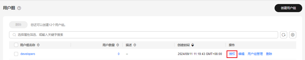 - 在用户组列表中,单击新建用户组“developers”右侧的“授权”。