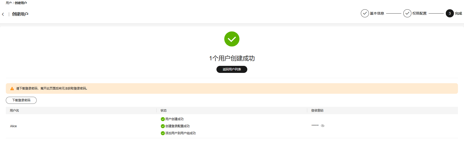 如果步骤4勾选了“密码设置 > 自动生成”,可在此页面下载密码。图3 创建成功