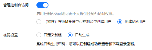 - 如果仍然选择创建iam用户,则需要配置密码类型。