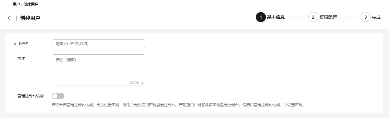 - 在“创建用户”页面配置“用户名”。不支持批量创建用户。