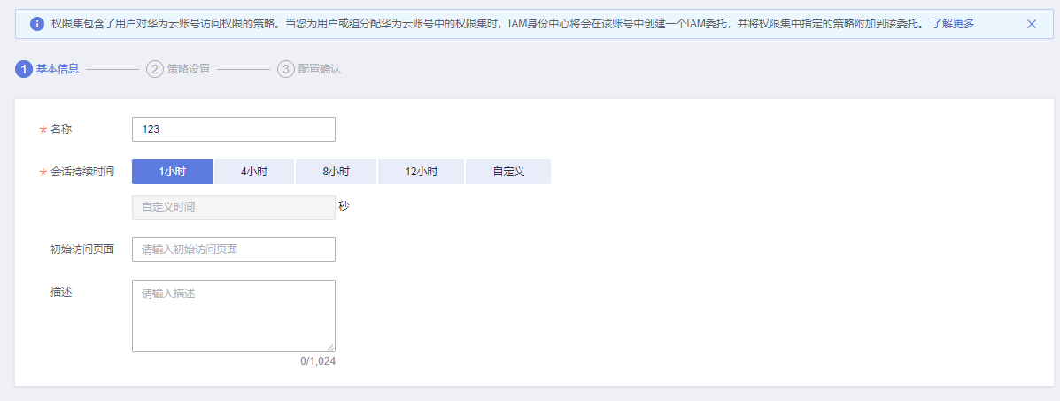 - 在“基本信息”页签中配置权限集的基本信息,配置完成后,单击“下一步”。