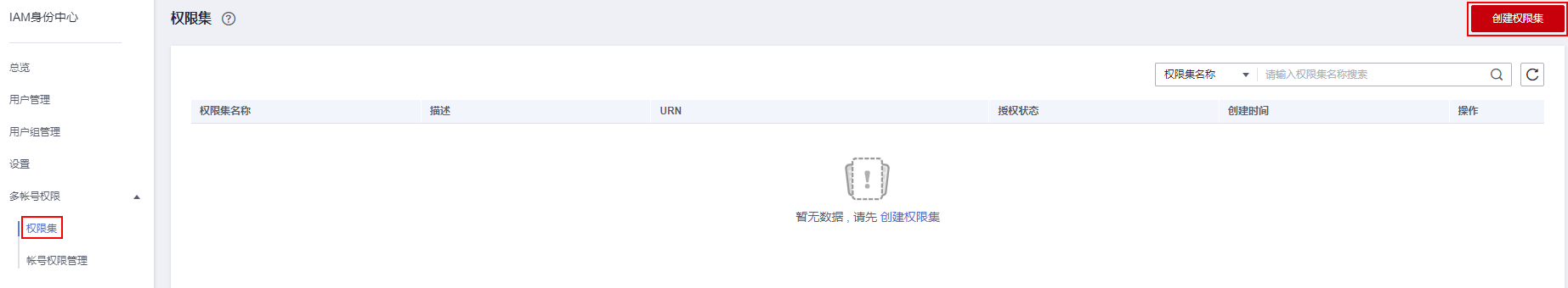 ,选择“管理与监管 > iam身份中心”,进入“iam身份中心”页面。 - 在左侧导航栏中,选择“多账号权限 > 权限集”,进入“权限集”页面。