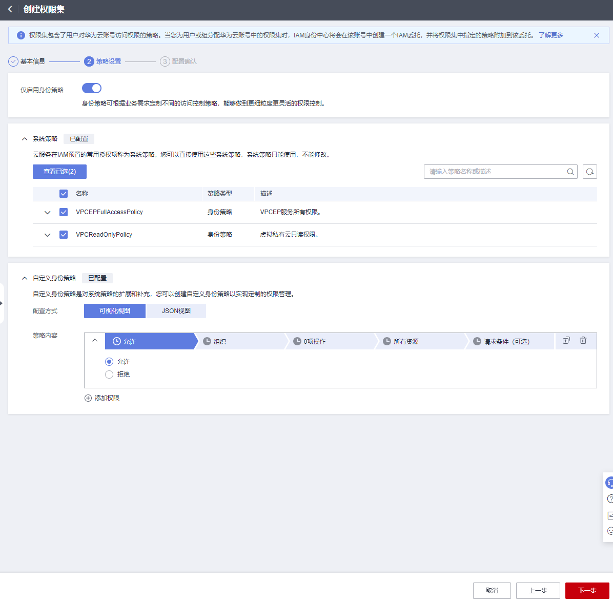 - 进入“策略设置”页签,配置权限集的系统策略、自定义身份策略和自定义策略,单击“下一步”。