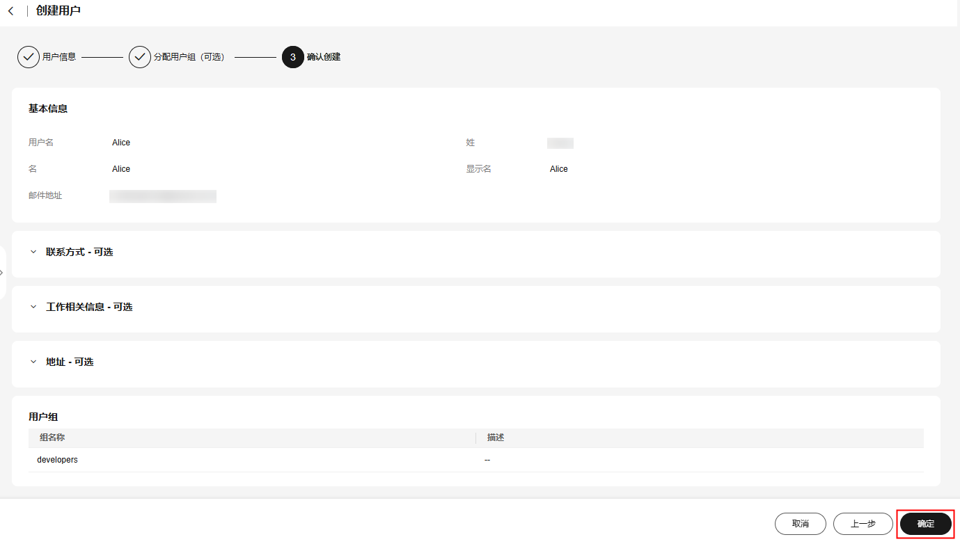 - 进入“确认创建”页面,确认配置无误后,单击页面右下角的“确定”,用户创建完成,用户列表中显示新创建的用户。