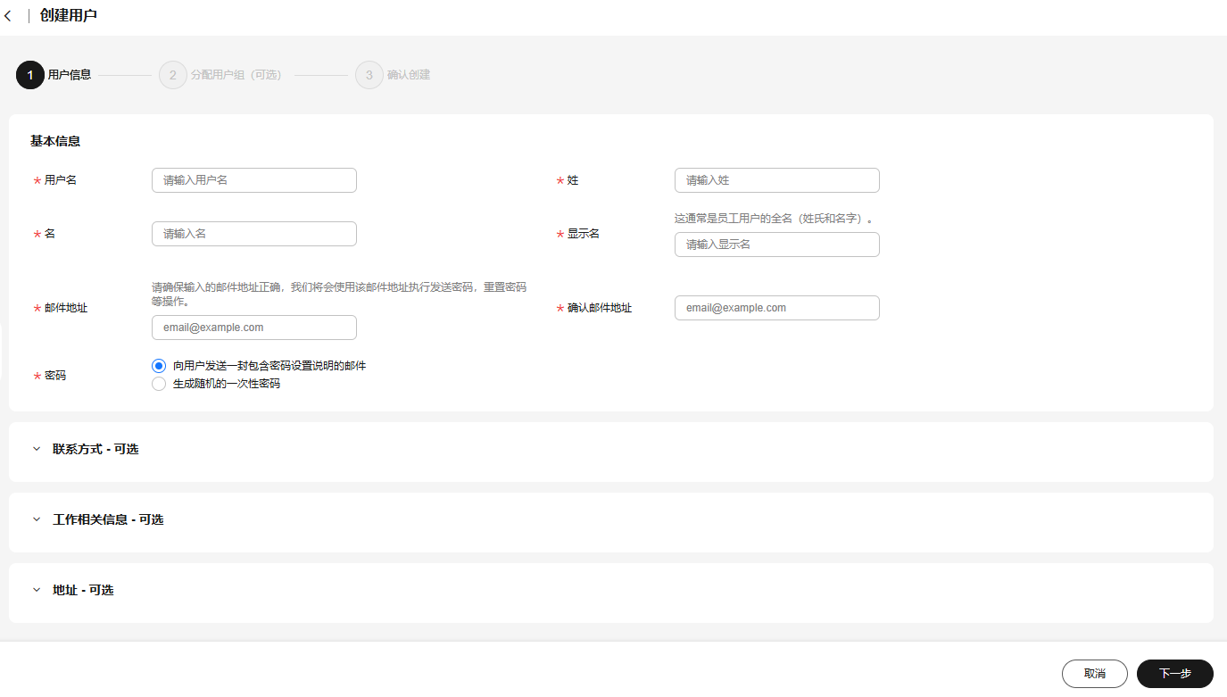 - 配置用户信息,配置完成后,单击页面右下角的“下一步”。