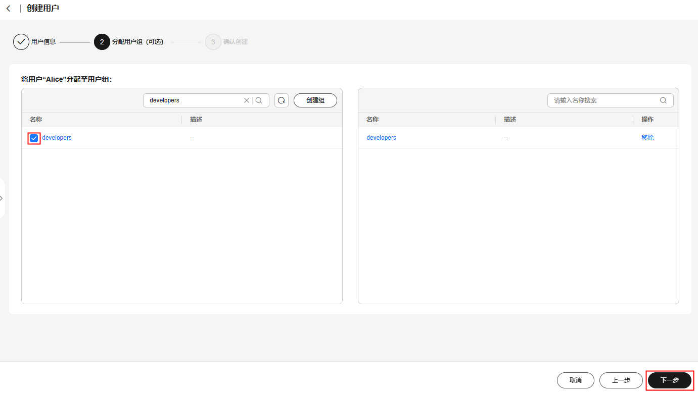 - (可选)进入“分配用户组(可选)”页面,勾选要加入的用户组,将用户加入到用户组。加入用户组后,用户将具备用户组的权限。配置完成后,单击页面右下角的“下一步”。